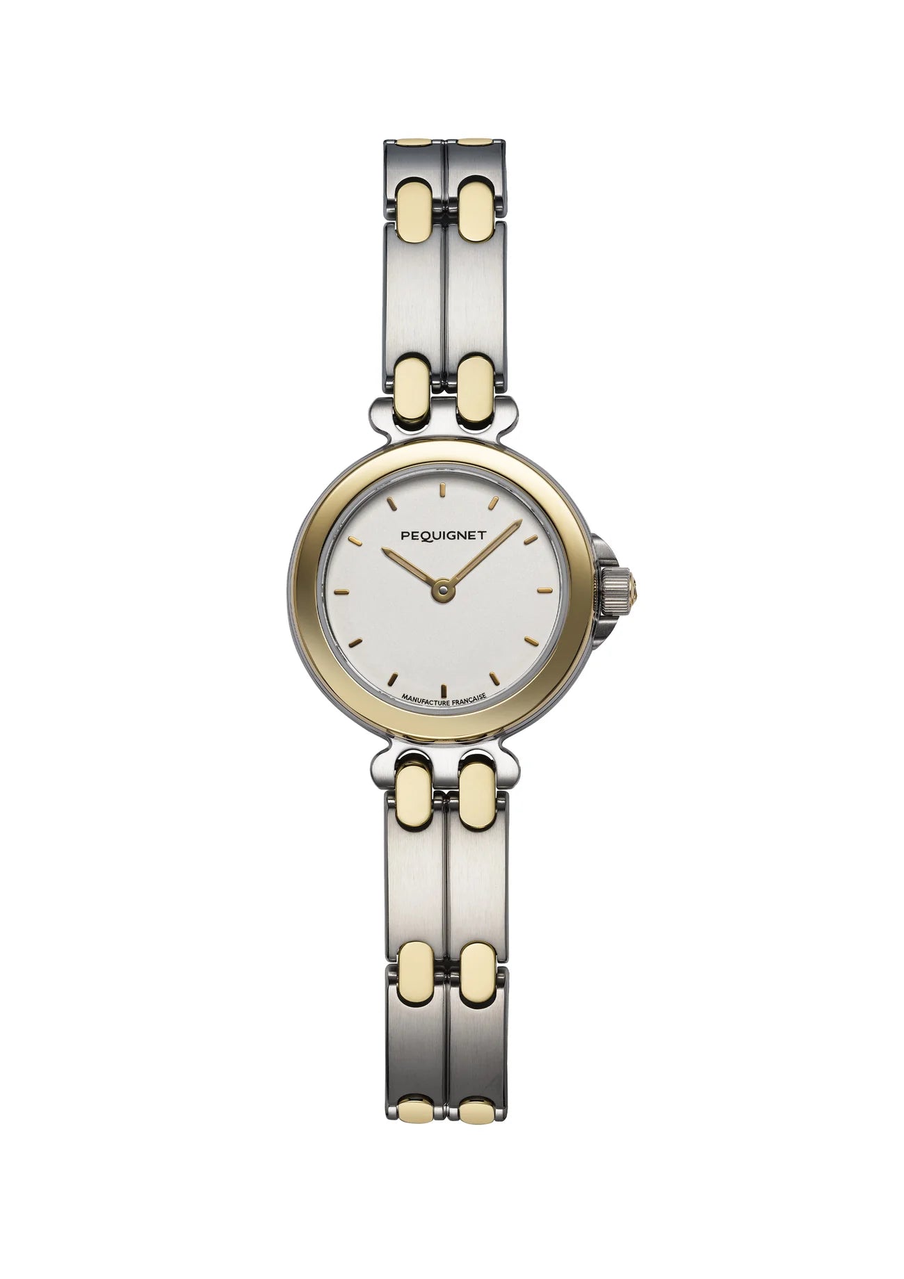 A symbol of Pequignet's innovation, this model is the heir to the first model that combined the preciousness of gold with the power of steel. Its legendary link asserts itself in two shades that unite to form one. The gold is thus sublimated by this contrast and highlights the white dial and the 3N gold bezel. The 25mm diameter watch is equipped with a Swiss ETA quartz mechanism, renowned for its reliability and precision.